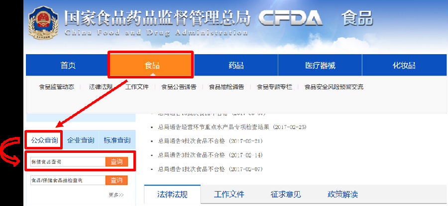 步驟1:登錄www.cfda.gov.cn,點(diǎn)擊“食品”欄目。
