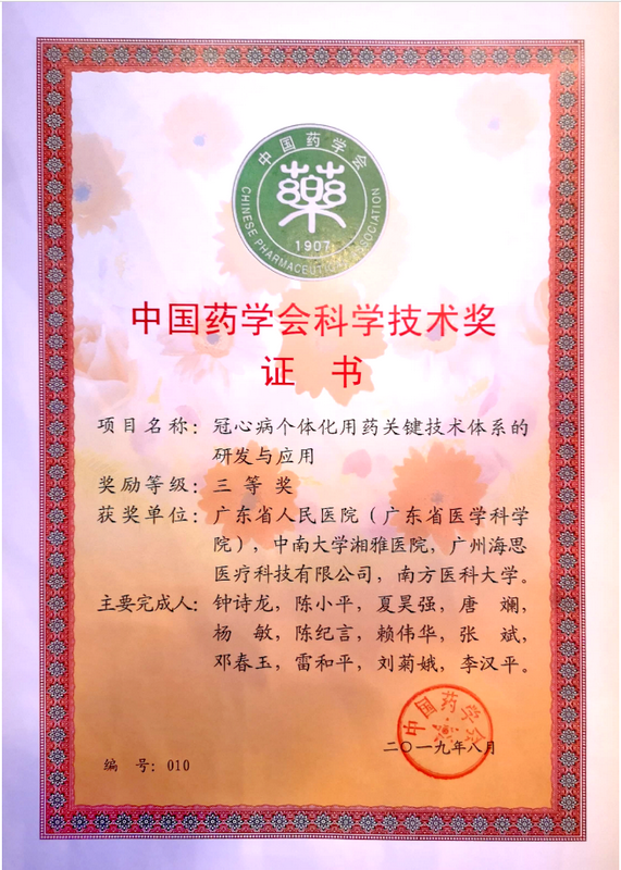 一、廣東省人民醫(yī)院藥學部鐘詩龍等的《冠心病個體化用藥關鍵技術體系的研發(fā)與應用》,榮獲2019年中國藥學會科學技術獎三等獎。