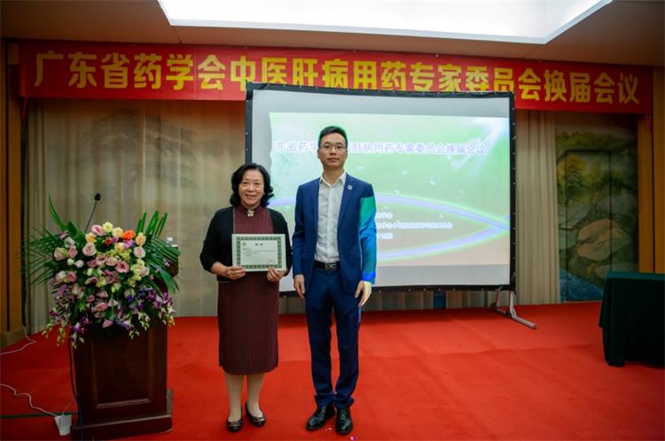 廣東省藥學(xué)會(huì)王勇主任為第三屆專家委員會(huì)主任委員池曉玲教授頒發(fā)聘書(shū)