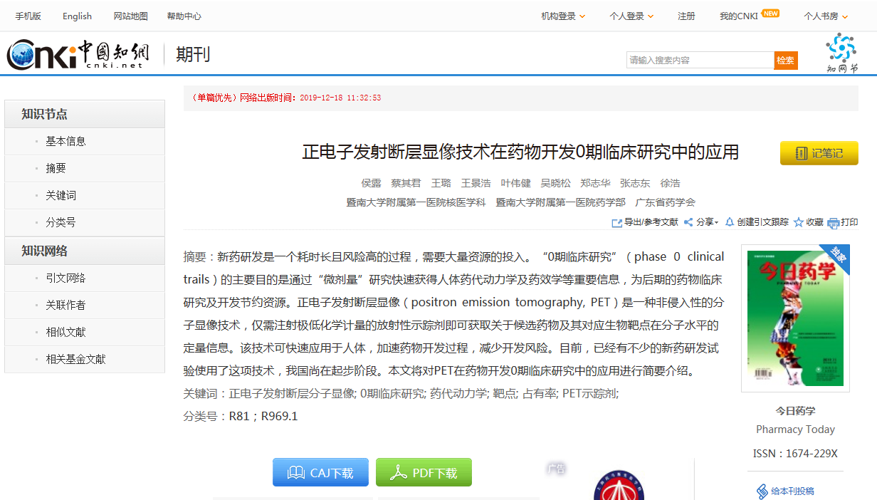近日,暨南大學(xué)附屬第一醫(yī)院核醫(yī)學(xué)科聯(lián)合藥學(xué)部、廣東省藥學(xué)會,在《今日藥學(xué)》發(fā)表綜述性論文“正電子發(fā)射斷層顯像技術(shù)在藥物開發(fā)0期臨床研究中的應(yīng)用”,根據(jù)國際藥物開發(fā)模式,在國內(nèi)首次正式提出利用PET分子影像進行藥物開發(fā)0期臨床研究的概念。核醫(yī)學(xué)科徐浩教授為通訊作者,研究生侯露同學(xué)為第一作者?;匦铀倨鱌ET藥物中心王璐博士、藥學(xué)部王景浩博士、廣東省藥學(xué)會副理事長兼秘書長鄭志華主任藥師對該工作給予了重要指導(dǎo)。