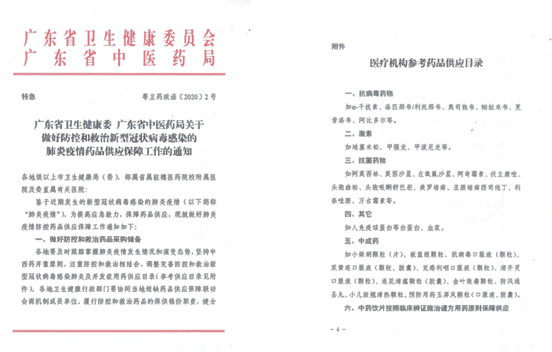 2020年1月21日,廣東省衛(wèi)健委委托陳吉生主任、吳紅衛(wèi)主任起草針對新型冠狀病毒感染肺炎有關“落實用藥相關制度”的建議和“醫(yī)療機構防控和救治藥品供應目錄”;1月23日廣東省衛(wèi)生健康委及廣東省中醫(yī)藥局下發(fā)《關于做好防控和救治新型冠狀病毒感染的肺炎疫情藥品供應保障工作的通知》(粵衛(wèi)藥政函[2020]2號),文件中采用了陳主任關于用藥相關制度的建議及救治藥品供應目錄。