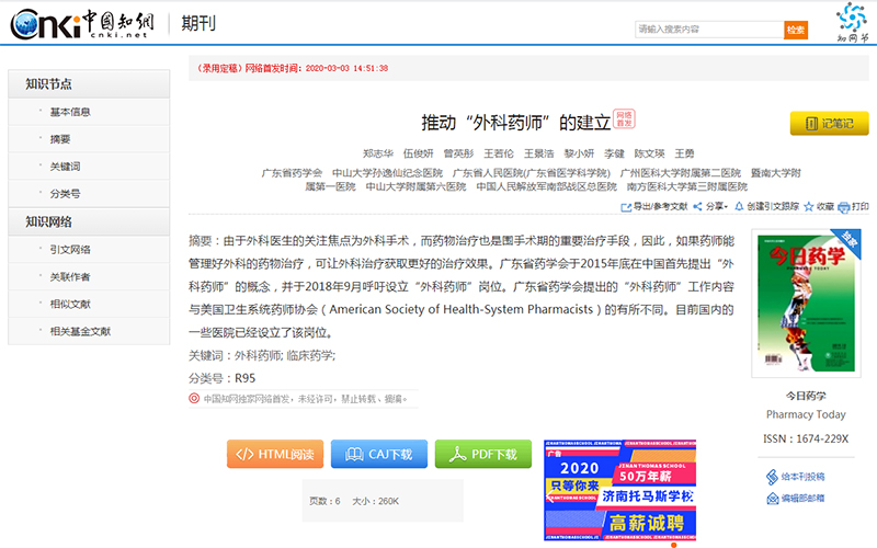 近期,廣東省藥學(xué)會(huì)(以下簡(jiǎn)稱“本會(huì)”)關(guān)于推動(dòng)在中國(guó)設(shè)立“外科藥師”的文章在《歐洲醫(yī)院藥學(xué)雜志》(European Journal of Hospital Pharmacy)發(fā)表[1]。