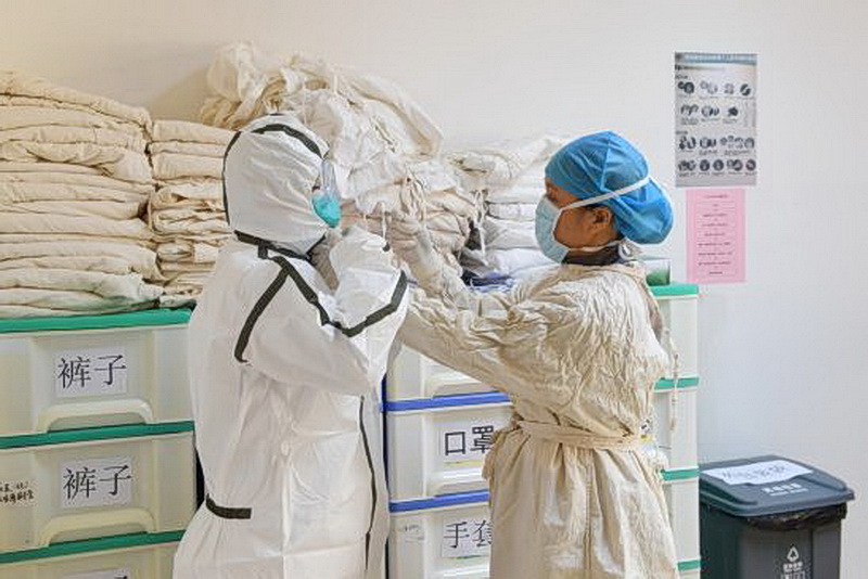 靜配中心甘雁妃(右)為同伴穿戴、檢查防護(hù)服