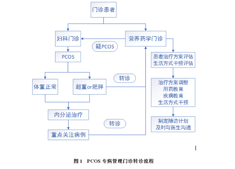 深圳市中醫(yī)院婦科年門診量在10 萬人次左右,而PCOS 患者是其常見的就診人群之一,尤其是肥胖PCOS 患者的管理問題成為影響治療效果的決定性因素。通過婦科醫(yī)生向藥師以轉(zhuǎn)診的形式對需要重點(diǎn)關(guān)注PCOS 患者進(jìn)行管理。PCOS 專病管理門診具體轉(zhuǎn)診流程見圖1。