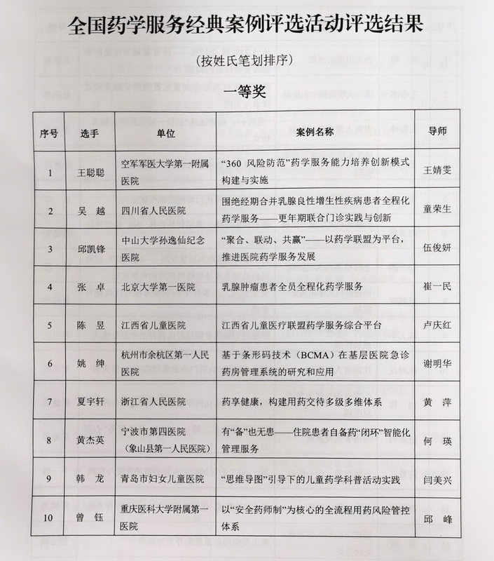 經(jīng)本省選拔推薦,中國(guó)藥學(xué)會(huì)藥學(xué)服務(wù)專業(yè)委員會(huì)評(píng)定,中山大學(xué)孫逸仙紀(jì)念醫(yī)院邱凱鋒、導(dǎo)師伍俊妍的案例――《“聚合、聯(lián)動(dòng)、共贏”--以藥學(xué)聯(lián)盟為平臺(tái),推進(jìn)醫(yī)院藥學(xué)服務(wù)發(fā)展》――榮獲2020 年全國(guó)藥學(xué)服務(wù)經(jīng)典案例評(píng)選一等獎(jiǎng)。