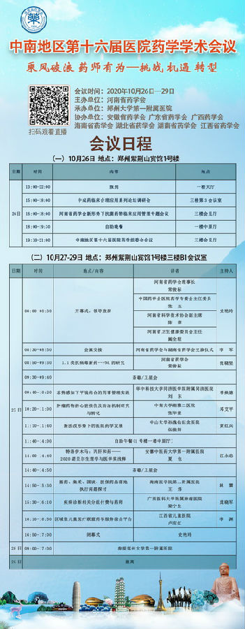 為推動(dòng)我國(guó)新醫(yī)改形勢(shì)下醫(yī)院藥學(xué)發(fā)展、促進(jìn)醫(yī)院藥學(xué)學(xué)科建設(shè),提升藥師專業(yè)技術(shù)水平和藥學(xué)服務(wù)能力,加強(qiáng)中南地區(qū)醫(yī)院藥學(xué)學(xué)術(shù)交流,由中南地區(qū)八省共同主辦,河南省藥學(xué)會(huì)承辦的“中南地區(qū)第十六屆醫(yī)院藥學(xué)學(xué)術(shù)會(huì)議”定于2020年10月26-29日在河南省鄭州市舉辦。