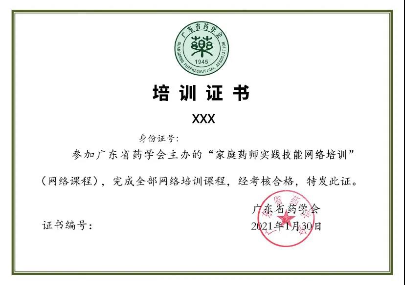 通過培訓(xùn)考核您將獲得廣東省藥學(xué)會(huì)頒發(fā)的培訓(xùn)證書(電子證書,電子證書以實(shí)物為準(zhǔn))。