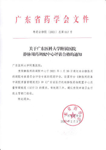 2021年2月3日廣東省藥學(xué)會(huì)正式文件通知:廣東醫(yī)科大學(xué)附屬醫(yī)院靜脈用藥調(diào)配中心評(píng)估合格!