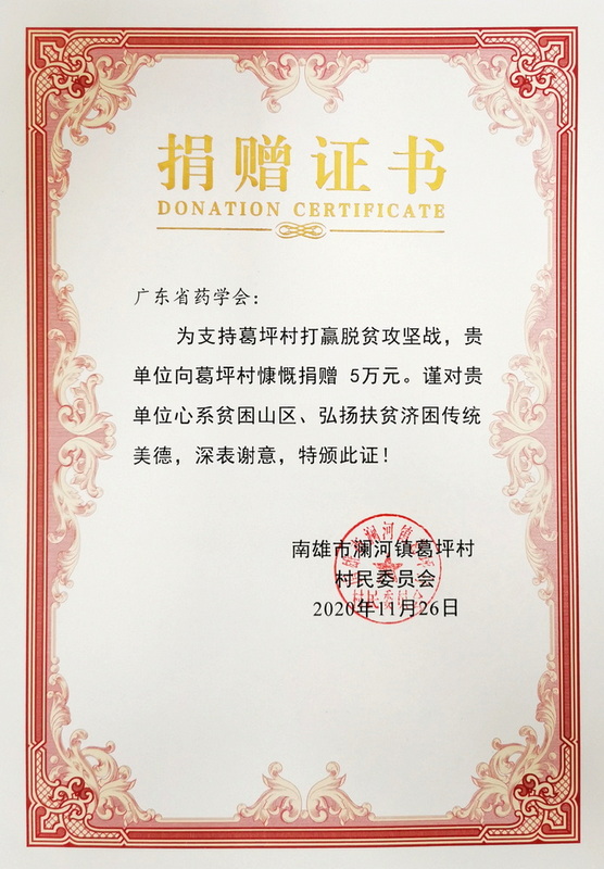 2020年10月22日,支部書記兼執(zhí)行秘書長陳民喜親自參加省藥品監(jiān)管局扶貧調(diào)研組赴葛坪村調(diào)研。到葛坪村村委會參與座談,參觀考察中藥材種植基地和中藥材加工廠,同與會專家一道,為助力葛坪村精準脫貧出力獻計;學會秘書處、黨支部還研究決定,由學會捐贈人民幣5萬元,捐助葛坪村中藥材種植相關(guān)產(chǎn)業(yè)扶貧項目及葛坪村公共設(shè)施建設(shè),并于近日收到了南雄市瀾河鎮(zhèn)葛坪村村委會寄來的捐贈榮譽證書。