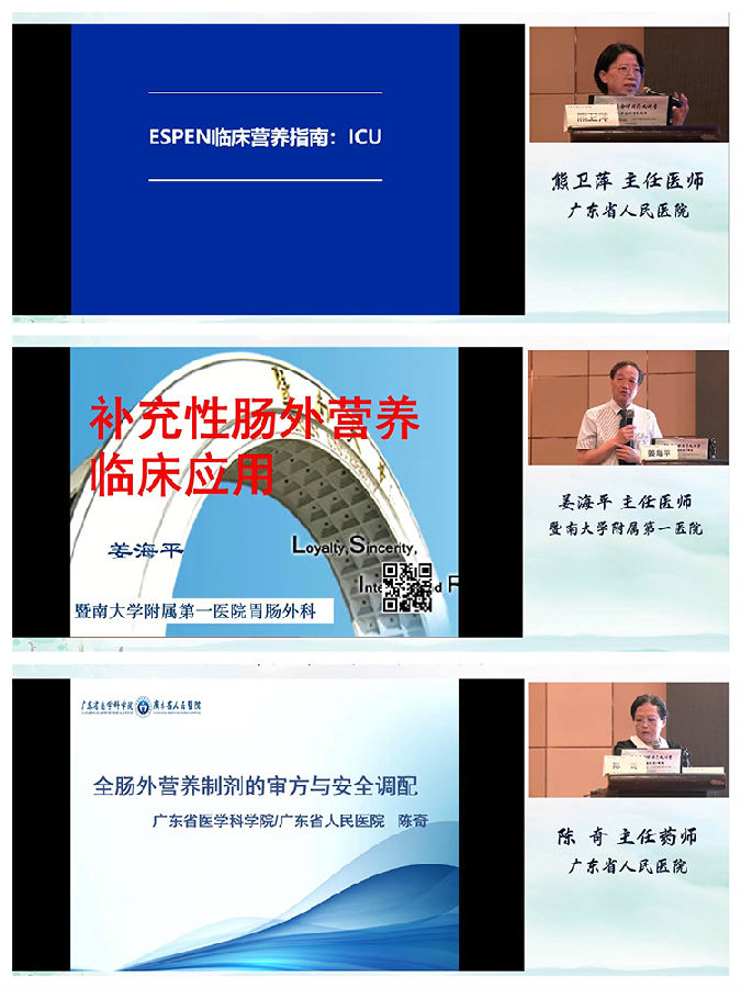 腸外營養(yǎng)制劑專場由廣東省人民醫(yī)院熊衛(wèi)萍主任醫(yī)師、暨南大學附屬第一醫(yī)院姜海平主任醫(yī)師和廣東省人民醫(yī)院陳奇主任藥師授課,分別分享了《ESPEN臨床營養(yǎng)指南:ICU》《補充性腸外營養(yǎng)的臨床應用》《全腸外營養(yǎng)制劑的審方與安全調(diào)配》等內(nèi)容。