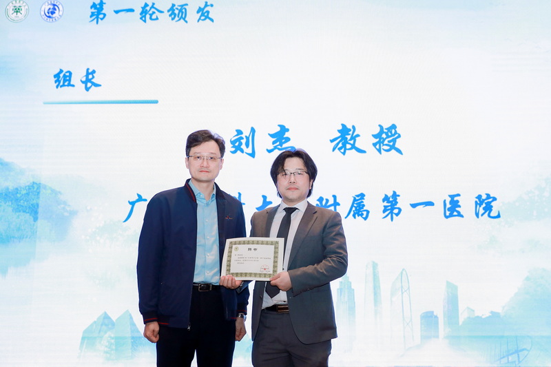 鄭志華副理事長(zhǎng)兼秘書長(zhǎng)為第一屆罕見(jiàn)病呼吸學(xué)組組長(zhǎng)、廣州醫(yī)科大學(xué)附屬第一醫(yī)院教授劉杰頒發(fā)聘書
