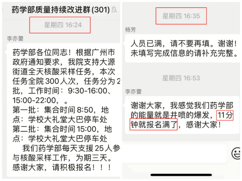 藥學(xué)部接到任務(wù)后,李亦蕾主任當(dāng)即于下午16:24時(shí)在本部工作群發(fā)出通知,僅僅11分鐘后、16:35時(shí)就集結(jié)完畢,這不是“雙十一”秒殺活動(dòng),也不是搶購(gòu)“春運(yùn)”火車票,而僅僅是南醫(yī)藥師們參加支援白云區(qū)大源村核酸檢測(cè)任務(wù)的報(bào)名活動(dòng)。黨員藥師帶頭,全體藥師紛紛響應(yīng),用實(shí)際行動(dòng)踐行初心使命。為了確保任務(wù)的完成,藥學(xué)部還另組織了20名藥師的替補(bǔ)隊(duì)伍,這就是南醫(yī)藥學(xué)人的速度與激情。?