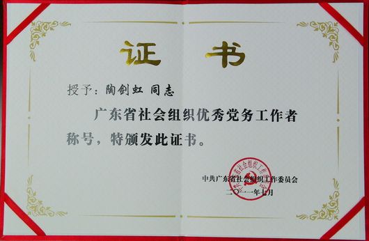 2011年7月18日下午,在中共廣東省社會組織工作委員會召開的表彰大會上,廣東省藥學會黨支部被授予“廣東省社會組織先進黨組織”光榮稱號,學會秘書長、黨支部書記陶劍虹被評為“廣東省社會組織優(yōu)秀黨務(wù)工作者”。