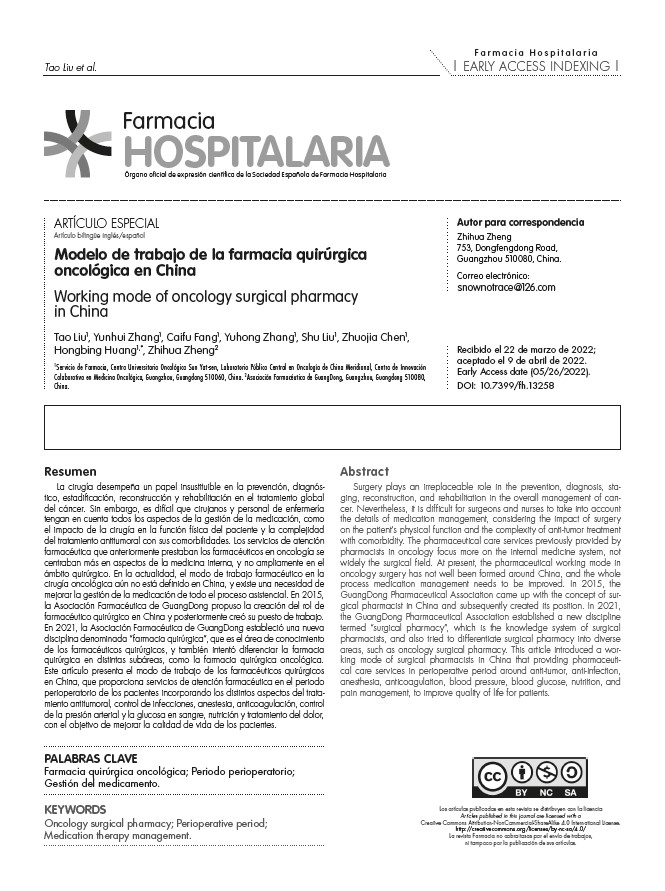 近日,廣東省藥學(xué)會(huì)(以下簡(jiǎn)稱(chēng)“本會(huì)”)關(guān)于“外科藥學(xué)”的專(zhuān)論——“中國(guó)腫瘤外科藥學(xué)工作模式”一文,在西班牙Farmacia Hospitalaria(《醫(yī)院藥學(xué)》)雜志以西班牙文和英文同時(shí)發(fā)表,鏈接為http://revistafarmaciahospitalaria.sefh.es/gdcr/index.php/fh/article/view/13258,其西班牙文和英文PDF版均可在此鏈接下載。這篇專(zhuān)論是Farmacia Hospitalaria雜志通過(guò)國(guó)際藥學(xué)聯(lián)合會(huì)(International Pharmaceutical Federation,F(xiàn)IP)向本會(huì)約稿,由中山大學(xué)腫瘤防治中心劉韜主任團(tuán)隊(duì)撰寫(xiě),是本會(huì)第一篇以西班牙文發(fā)表的論文。