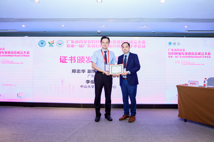 隨后,鄭秘書長(zhǎng)宣讀了廣東省藥學(xué)會(huì)第一屆婦科腫瘤專家委員會(huì)任職文件:中山大學(xué)腫瘤防治中心李俊東擔(dān)任首屆主任委員,中山大學(xué)附屬第一醫(yī)院何勉、中山大學(xué)孫逸仙紀(jì)念醫(yī)院張丙忠、廣州醫(yī)科大學(xué)附屬第三醫(yī)院生秀杰、汕頭大學(xué)附屬腫瘤醫(yī)院李從鑄、中山大學(xué)腫瘤防治中心劉韜、中國(guó)醫(yī)學(xué)科學(xué)院腫瘤醫(yī)院深圳醫(yī)院孫力、廣州醫(yī)科大學(xué)附屬腫瘤醫(yī)院簡(jiǎn)曉順、中山大學(xué)腫瘤防治中心萬(wàn)挺8人擔(dān)任副主任委員,中山大學(xué)腫瘤防治中心萬(wàn)挺和李曉燕兼任本屆專委會(huì)秘書。鄭志華秘書長(zhǎng)為本屆專委會(huì)主任委員李俊東頒發(fā)聘書,李俊東主任委員為副主任委員頒發(fā)聘書。