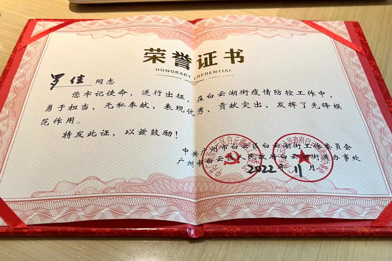 白云街道頒給羅佳藥師的榮譽(yù)證書