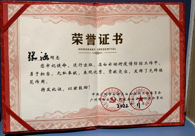 白云街道頒給張涵藥師的榮譽(yù)證書