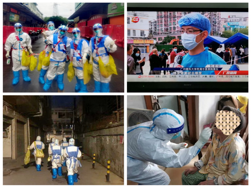 二、勇往直前,敢于擔(dān)當(dāng)。按照上級(jí)統(tǒng)一部署,藥學(xué)部先后派出譚婧、謝燦坤、王明歡、許江濤、朱國(guó)威等10多名藥師參加突擊隊(duì)進(jìn)駐海珠、白云、荔灣高風(fēng)險(xiǎn)封控區(qū)域援助抗疫。疫情初發(fā)時(shí)病源主要集中在海珠區(qū)和白云區(qū)的城中村,人口密度高、環(huán)境復(fù)雜,村里大多數(shù)是“握手樓”,巷子窄,光線暗,他們的任務(wù)是上門挨家挨戶做抗原檢測(cè)、核酸檢測(cè),進(jìn)行疫情排查,但是一開(kāi)始時(shí)對(duì)上門采樣地理位置不熟悉,尋覓位置相對(duì)比較困難,需要一戶戶進(jìn)行電話咨詢。每天掃樓任務(wù)非常艱巨,身上還掛滿酒精、拭子、試管負(fù)重爬樓,有時(shí)候甚至要工作到半夜,打著手電在夜色深巷中行進(jìn),仿佛一只只孤單的螢火蟲(chóng)在黑暗穿梭,與病毒作堅(jiān)強(qiáng)的斗爭(zhēng)。汗水濕透的衣服、霧氣蒸騰的面屏、勒出皺褶的臉龐和雙手,換回了“滿載而歸”的采樣標(biāo)本。即使環(huán)境如此惡劣,工作強(qiáng)度如此高,我們的藥師們始終保持樂(lè)觀的心態(tài),不畏艱苦,迎難而上!