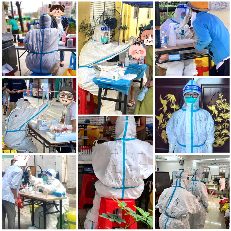 二、核酸采樣,變身“大白”。11月7日,醫(yī)院籌備核酸采集后備隊(duì)。藥學(xué)部同事們積極響應(yīng),原計(jì)劃額定23人,短瞬半小時(shí)之內(nèi)就有27人報(bào)名,人人奮勇爭(zhēng)行。之前沒采過核酸?沒關(guān)系,認(rèn)真參加醫(yī)院的采核酸培訓(xùn),一點(diǎn)一滴、仔仔細(xì)細(xì)把相關(guān)工作學(xué)精準(zhǔn)學(xué)到位,確保上前線的每一個(gè)藥師都是勝任的。我們有這個(gè)自信,藥師的本職工作雖與“大白”無關(guān),但“召必應(yīng)、應(yīng)必戰(zhàn)”,也肯定能把核酸采樣的工作保質(zhì)保量、高效完成!迄今為止,藥學(xué)部已有22人次參與共50次核酸采樣任務(wù),共計(jì)采樣達(dá)27780人次。尤其是臨床藥師曾嘉煒副主任藥師,在抗疫一線中,作為醫(yī)院核酸采樣應(yīng)急后備隊(duì)員多次深入白云區(qū)、海珠區(qū)、荔灣區(qū)等管控一線支援抗疫任務(wù)。