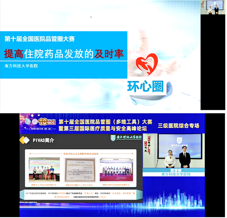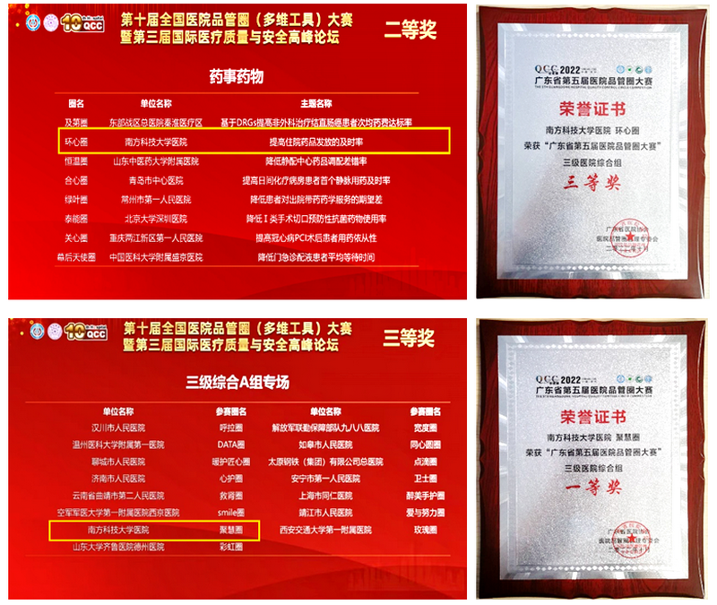 2022年11月27日,南方科技大學(xué)醫(yī)院靜配中心“環(huán)心圈”和“聚慧圈”在第十屆全國醫(yī)院品管圈大賽中,從來自31個省市自治區(qū)、1030個圈組中脫穎而出,經(jīng)過激烈角逐,分別斬獲藥事藥物組“二等獎”、三級綜合A組專場“三等獎”。