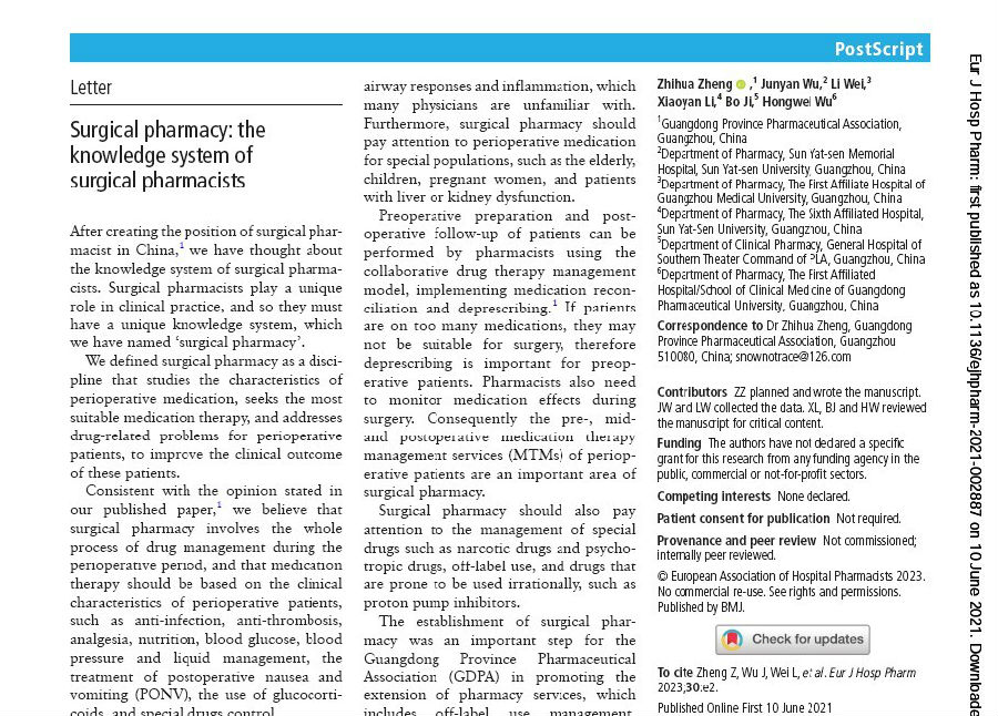 2021年6月,本會在BMJ系列期刊——《歐洲醫(yī)院藥學雜志》(European Journal of Hospital Pharmacy)發(fā)表了“外科藥師的知識體系——外科藥學(Surgical Pharmacy)”一文,介紹了“外科藥學”產生的背景、定義、學科框架、特點、意義等內容。一些國外藥師來信進行了相關問題的討論。