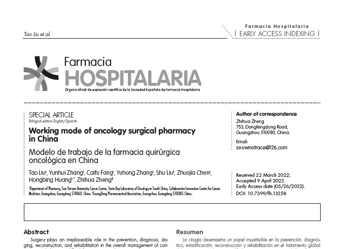 西班牙《醫(yī)院藥學》雜志發(fā)表“中國腫瘤外科藥學工作模式”專文