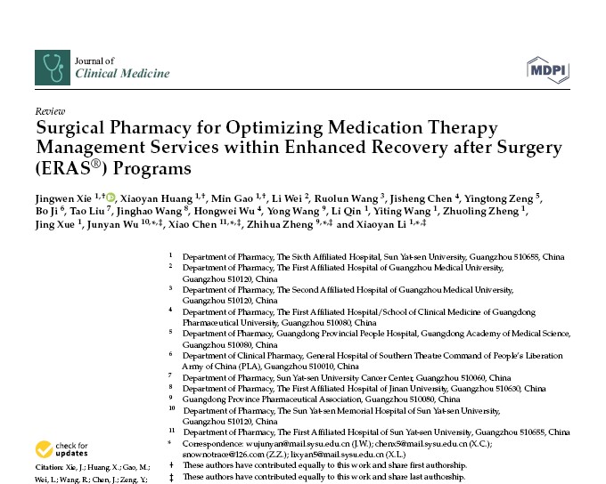 2023年1月,由中山大學附屬第六醫(yī)院黎小妍主任團隊撰寫的“外科藥學用于優(yōu)化加速康復外科(ERAS?)的藥物治療管理服務”綜述在Q2區(qū)的《臨床醫(yī)學雜志》(Journal of Clinical Medicine)發(fā)表,該文綜述了圍手術期抗感染、抗血栓、鎮(zhèn)痛、營養(yǎng)治療、血糖、血壓、液體管理、惡心嘔吐、術后譫妄的處理等的主要治療策略和注意事項,探討外科藥師參與圍手術期用藥管理的方式和途徑,以優(yōu)化ERAS的藥物治療管理服務。