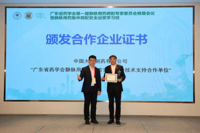 楊威主委為中國(guó)大冢制藥有限公司頒發(fā)“廣東省藥學(xué)會(huì)靜脈用藥調(diào)配專家委員會(huì)技術(shù)支持合作單位”證書。劉韜主任、王勇主任為靜配中心評(píng)估工作“先進(jìn)工作者”頒發(fā)證書。