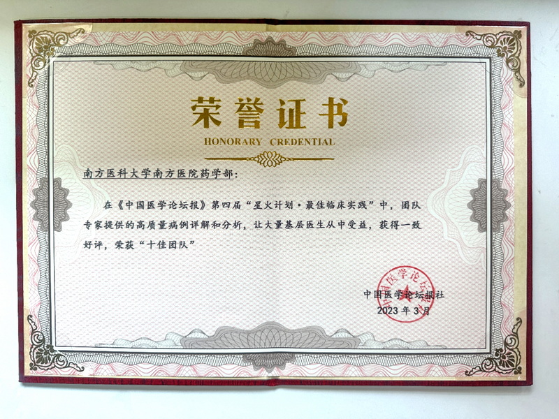近年來(lái),南方醫(yī)科大學(xué)南方醫(yī)院藥學(xué)部臨床藥學(xué)工作在李亦蕾主任、鄭萍主任等專家積極支持、直接參與下,臨床藥師長(zhǎng)期深入臨床實(shí)踐工作一線,累積了豐富的經(jīng)驗(yàn)和不少優(yōu)秀案例,選送的案例在“星火計(jì)劃”中多次獲獎(jiǎng),其中2021年團(tuán)隊(duì)榮獲“星火計(jì)劃-2021最佳臨床實(shí)踐”、楊彩華和謝聰藥師被評(píng)為“星火計(jì)劃·2021年度臨床用藥最受歡迎病例”。