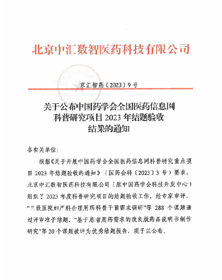 附件:紅頭-關于公布中國藥學會全國醫(yī)藥信息網(wǎng)2023年科普研究項目結題驗收結果的通知.pdf