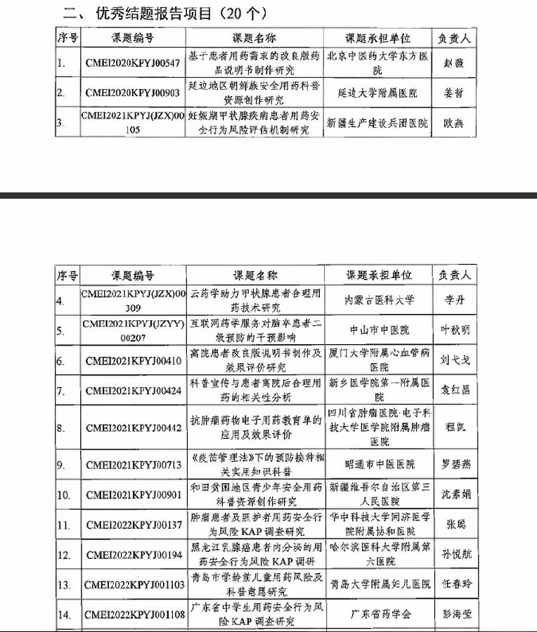 根據(jù)《關于開展中國藥學會全國醫(yī)藥信息網(wǎng)科普研究重點項目2023 年結題驗收的通知》(國藥會科[2023]3號)要求,北京中匯數(shù)智醫(yī)藥科技有限公司(原中國藥學會科技開發(fā)中心)組織了2023 年度科普研究項目的結題驗收工作。經(jīng)專家審評,共288 個課題通過評審、準予結題。其中20 個課題被評為優(yōu)秀結題報告。