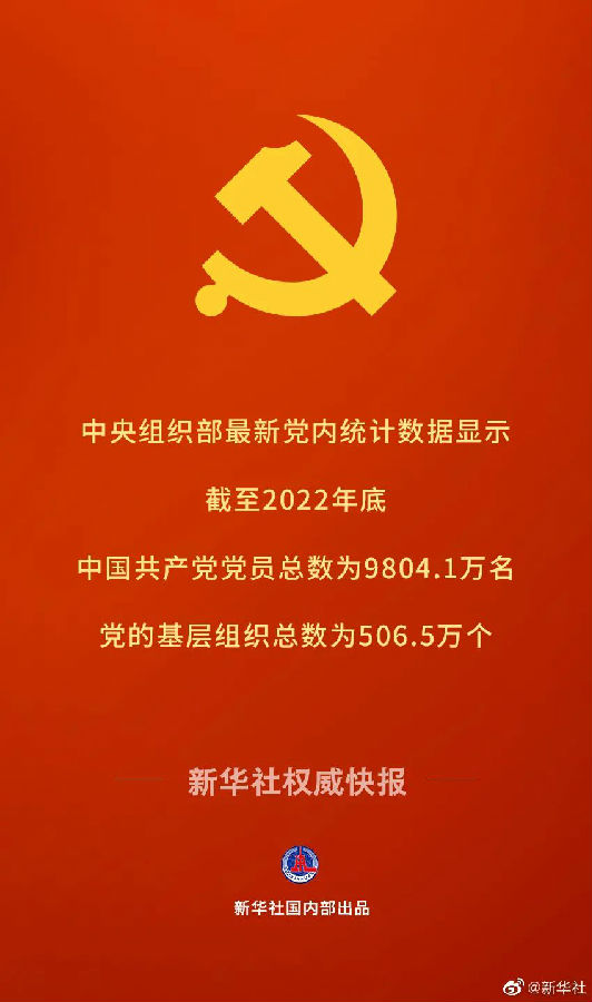 中央組織部最新黨內(nèi)統(tǒng)計數(shù)據(jù)顯示,截至2022年底,中國共產(chǎn)黨黨員總數(shù)為9804.1萬名,比上年凈增132.9萬名,黨的基層組織506.5萬個,比上年凈增12.9萬個。