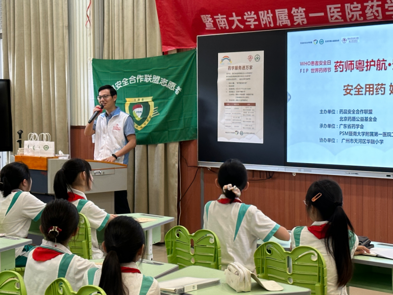 為迎接世界患者安全日和世界藥師節(jié),提升兒童群體安全用藥意識(shí),普及科學(xué)用藥知識(shí),PSM暨南大學(xué)附屬第一醫(yī)院工作站志愿者以安全用藥進(jìn)校園的形式,在天河區(qū)華融小學(xué)開展了“安全用藥,娃娃抓起”公益科普講座活動(dòng)。華融小學(xué)教導(dǎo)處張宏偉主任攜該校五年級(jí)學(xué)生150余人參加活動(dòng),本次活動(dòng)由華融小學(xué)潘莉莉老師主持。