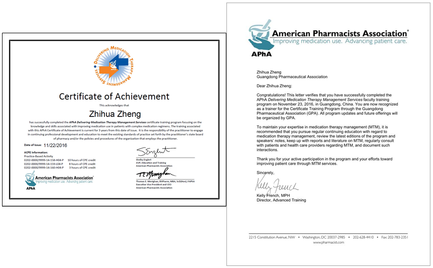 圖4 美國(guó)藥師協(xié)會(huì)(APhA)藥物治療管理(MTM)培訓(xùn)證書(shū)和講師證書(shū)