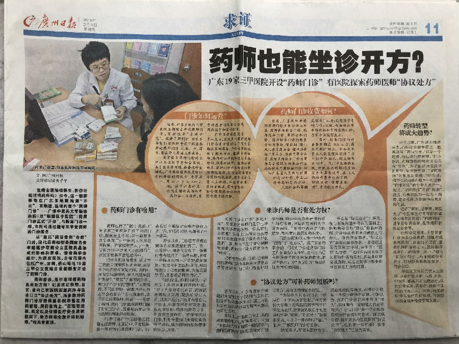隨后,廣東收費(fèi)的藥學(xué)門診如火如荼地開(kāi)展起來(lái)?!稄V州日?qǐng)?bào)》《光明日?qǐng)?bào)》等國(guó)內(nèi)重要媒體均報(bào)到了廣東的藥學(xué)門診工作。2018年4月,我會(huì)在BMJ系列期刊——《歐洲醫(yī)院藥學(xué)雜志》(European Journal of Hospital Pharmacy)發(fā)表了廣東省的藥學(xué)門診建設(shè)成果。