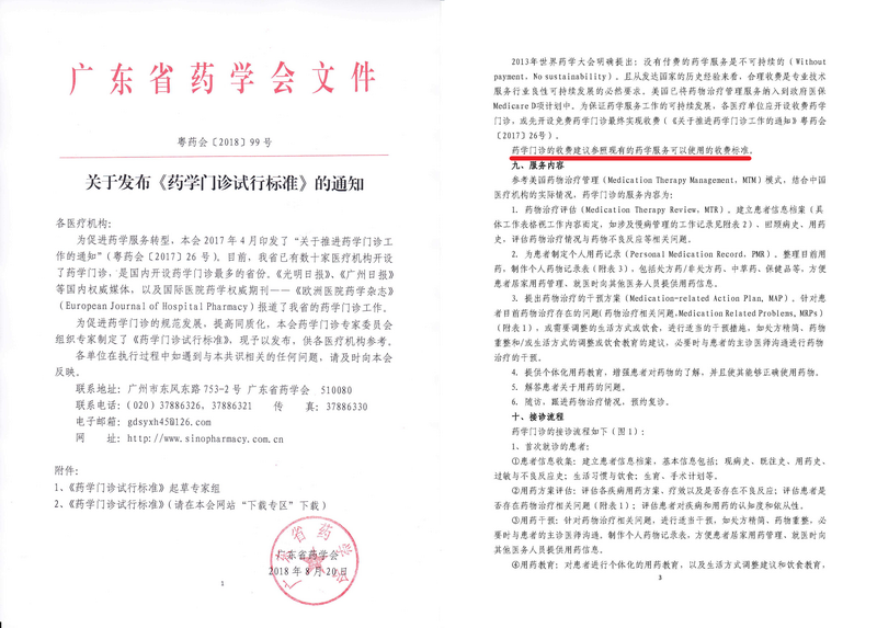 圖11 2018年8月廣東省藥學(xué)會(huì)《藥學(xué)門診試行標(biāo)準(zhǔn)》再次強(qiáng)調(diào)了收費(fèi)的重要性