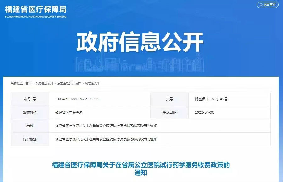 2022年4月,福建省醫(yī)療保障局發(fā)布關(guān)于在省屬公立醫(yī)院試行藥學(xué)服務(wù)收費(fèi)政策的通知,明確了藥物治療門診的收費(fèi)標(biāo)準(zhǔn)和醫(yī)保屬性,這是我國(guó)第一次將藥學(xué)門診收費(fèi)納入醫(yī)保。