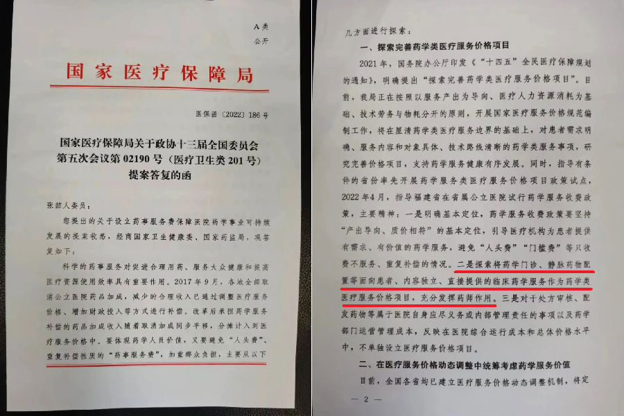 2022年9月,國(guó)家醫(yī)療保障局在答復(fù)政協(xié)張喆人委員關(guān)于設(shè)立藥事服務(wù)費(fèi)保障醫(yī)院藥學(xué)事業(yè)可持續(xù)發(fā)展的提案中指出,探索將藥學(xué)門診、靜脈藥物配置等面向患者、內(nèi)容獨(dú)立、直接提供的臨床藥學(xué)服務(wù)作為藥學(xué)類醫(yī)療服務(wù)價(jià)格項(xiàng)目,充分發(fā)揮藥師作用。