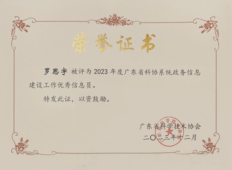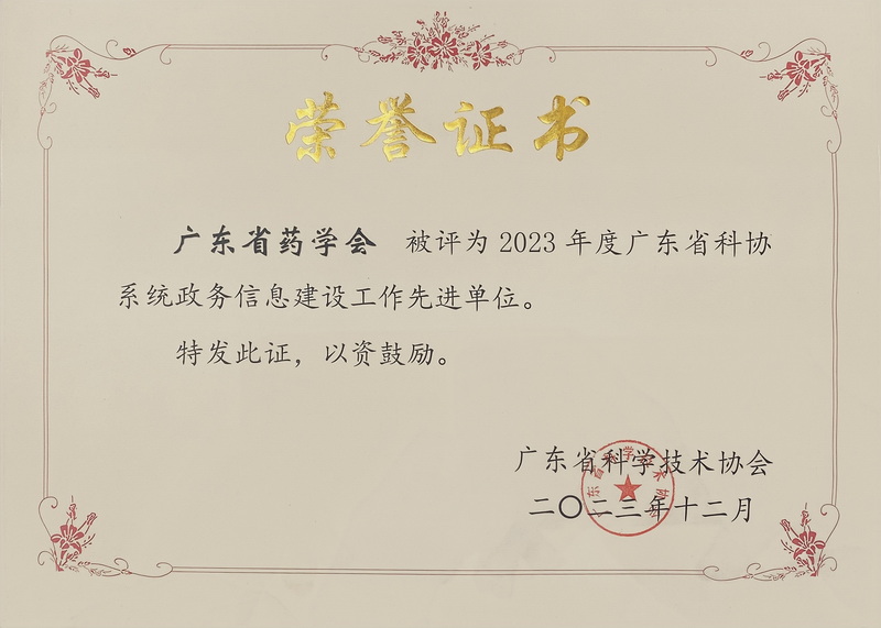 廣東省藥學(xué)會榮獲2023年度省科協(xié)系統(tǒng)政務(wù)信息建設(shè)工作先進單位