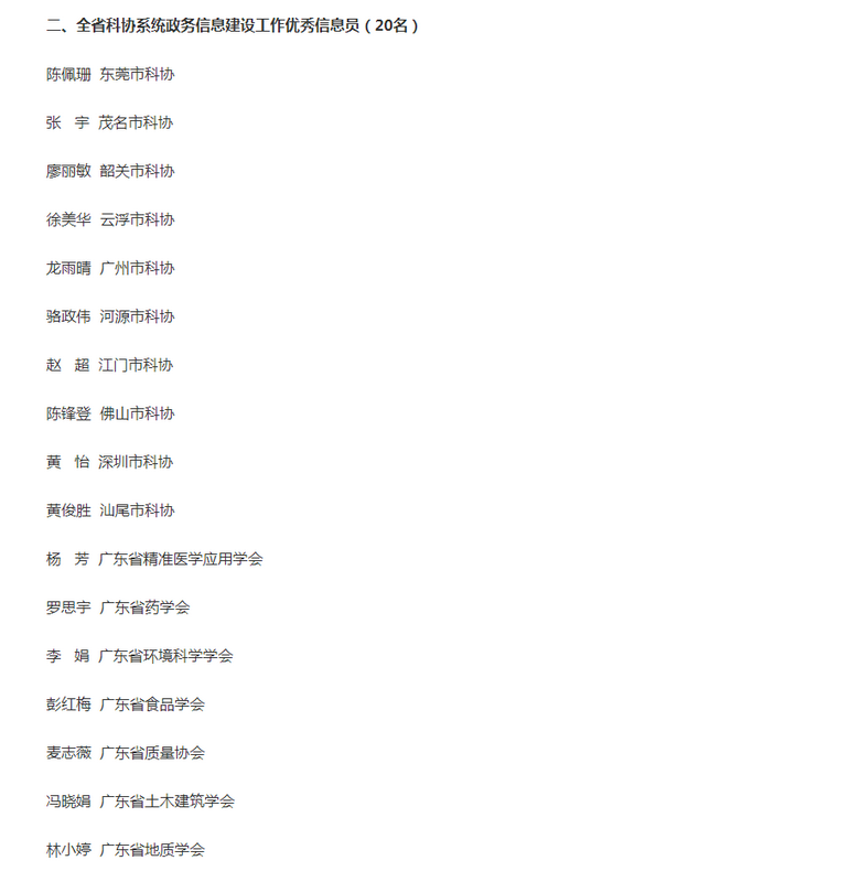 近日,廣東省科協(xié)辦公室發(fā)布了《關(guān)于公布2023年度全省科協(xié)系統(tǒng)政務(wù)信息建設(shè)工作先進單位、優(yōu)秀信息員及獲獎?wù)?wù)調(diào)研報告名單的通知》(粵科協(xié)辦發(fā)〔2023〕52號),根據(jù)中國科協(xié)、廣東省科協(xié)政務(wù)信息報送統(tǒng)計數(shù)據(jù),為激勵先進、總結(jié)經(jīng)驗,經(jīng)研究評選產(chǎn)生2023年度全省科協(xié)系統(tǒng)政務(wù)信息建設(shè)工作先進單位20個、優(yōu)秀信息員20名。廣東省藥學(xué)會獲評“先進單位”,學(xué)會秘書處羅思宇同志獲評“優(yōu)秀信息員”,分別名列學(xué)會系列第二。