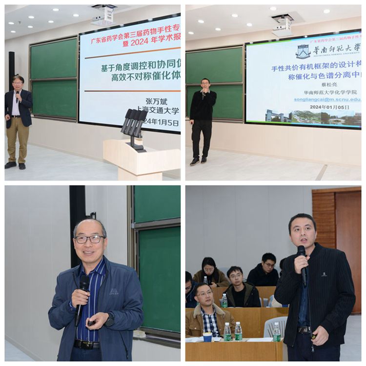 最后,會議舉行了藥物手性專委會2024年學(xué)術(shù)報告會,由新任常務(wù)副主任委員暨南大學(xué)陳國棟研究員主持。張萬斌、李向軍、華南師范大學(xué)蔡松亮教授、暨南大學(xué)王永恒研究員分別以不對稱催化體系構(gòu)建、手性共價有機框架構(gòu)筑、酶催化的立體化學(xué)調(diào)控機制、手性分子分離分析為主題進行了精彩的報告,展示了在各自研究領(lǐng)域的最新研究成果,為大家?guī)硪粓鼍始姵实膶W(xué)術(shù)盛宴。