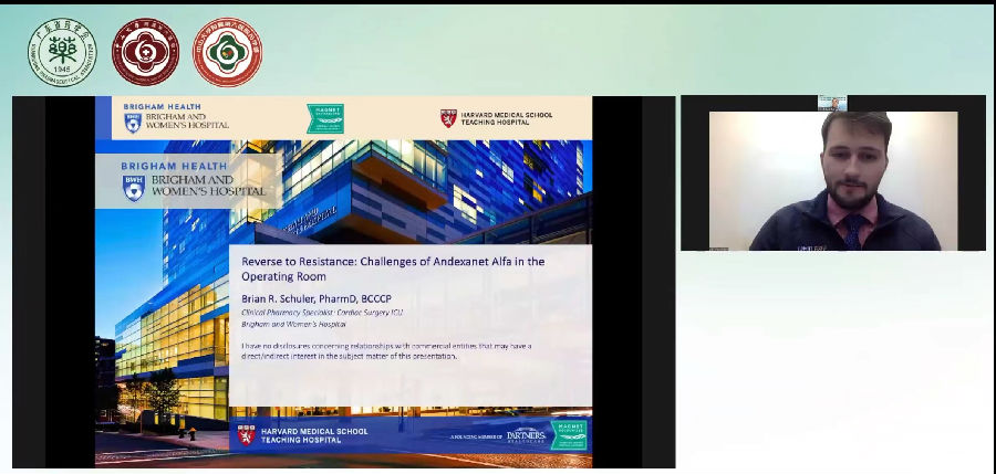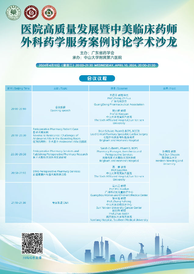 本次沙龍交流的主要內(nèi)容是來(lái)自Brigham and Women's Hospital 心臟外科首席專(zhuān)科臨床藥師 Brian Schuler 博士分享:逆轉(zhuǎn)抗藥性:手術(shù)室中 Andexanet Alfa 的挑戰(zhàn);來(lái)自Brigham and Women's Hospital麻醉和圍手術(shù)期藥學(xué)服務(wù)經(jīng)理 Sarah Culbreth 博士分享-圍手術(shù)期藥學(xué)服務(wù)與實(shí)踐研究以及中山大學(xué)附屬第六醫(yī)院高旻教授分享-加速康復(fù)外科圍術(shù)期藥學(xué)服務(wù)。