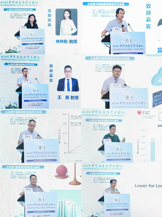 心血管代謝疾病藥物治療分會(huì)場:會(huì)議由廣東省藥學(xué)會(huì)心血管代謝疾病用藥專家委員會(huì)主任委員賓建平教授主持,廣東省藥學(xué)會(huì)王勇副理事長兼秘書長為會(huì)議致辭。他們一致強(qiáng)調(diào)了心血管代謝疾病對(duì)社會(huì)健康的嚴(yán)重威脅,并指出多學(xué)科協(xié)作對(duì)于攻克這一難題的必要性。學(xué)術(shù)報(bào)告環(huán)節(jié),王士超教授帶來“智慧化心臟康復(fù)在心血管代謝疾病全病程管理中的應(yīng)用”,指出智慧化心臟康復(fù)利用智能監(jiān)測設(shè)備和數(shù)據(jù)分析,提升臨床效果;麥憬霆教授分享了“糖心共治:SGLT2抑制劑與GLP-1RA誰更適合心血管高風(fēng)險(xiǎn)患者”,強(qiáng)調(diào)個(gè)體化治療;張培東教授分享了“暗流與燈塔:PCI圍術(shù)期代謝管理的精準(zhǔn)導(dǎo)航”,闡述區(qū)域化抗血小板策略進(jìn)入“全譜系、全周期”管理新時(shí)代。曾銳祥教授分享了“天平之舞:權(quán)衡腫瘤治療與心臟守護(hù)”,強(qiáng)調(diào)了心臟與腫瘤交叉學(xué)科的綜合管理;郭志強(qiáng)教授分享了“2025ACC血脂指南的更新要點(diǎn)”,分析了新指南對(duì)臨床的指導(dǎo)意義。各位討論嘉賓也針對(duì)會(huì)議的主題展開積極討論和分享。最后,廣東省藥學(xué)會(huì)心血管代謝疾病用藥專家委員會(huì)副主任委員、華南理工大學(xué)附屬第六醫(yī)院林仲秋教授在總結(jié)中強(qiáng)調(diào),本次會(huì)議匯集心內(nèi)科、腫瘤科、全科等多學(xué)科智慧,聚焦心血管代謝疾病前沿議題,促進(jìn)跨學(xué)科交流與合作,為心血管代謝疾病的精準(zhǔn)診療與全程管理提供新思路。