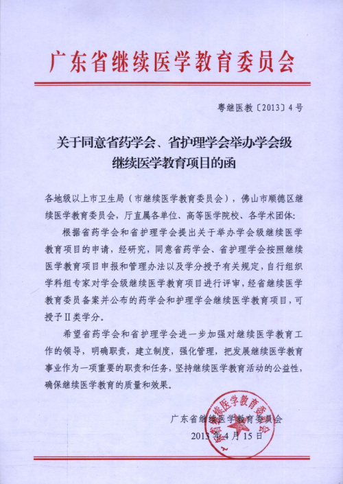根據(jù)廣東省繼續(xù)醫(yī)學(xué)教育委員會《關(guān)于同意省藥學(xué)會、省護(hù)理學(xué)會舉辦學(xué)會級繼續(xù)醫(yī)學(xué)教育項目的函》(粵繼醫(yī)教[2013]4號)的批復(fù),本會獲得授予繼續(xù)醫(yī)學(xué)教育項目Ⅱ類學(xué)分資格。