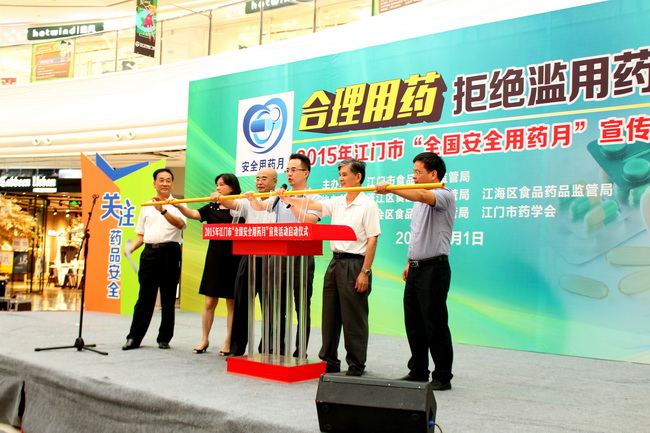 9月1日上午,由江門市食品藥品監(jiān)督管理局主辦,江門市藥學(xué)會、蓬江局、江海局和新會局聯(lián)合承辦的2015年“全國安全用藥月”江門啟動儀式在萬達(dá)廣場舉行。江門市副市長陳佳林出席啟動儀式并致詞,江門市政協(xié)副主席趙樹培以及市直相關(guān)部門的負(fù)責(zé)人參加,啟動儀式由江門市食品藥品監(jiān)督管理局局長方國平主持,來自市區(qū)相關(guān)藥品生產(chǎn)、經(jīng)營、醫(yī)療機構(gòu)及市民代表共300多人參加活動。