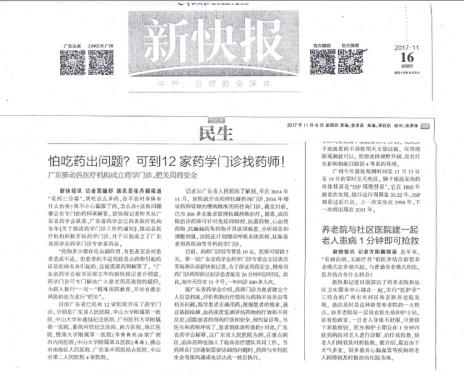 2017年11月16日,《新快報(bào)》以“怕吃藥出問題?可到12家藥學(xué)門診找藥師”為題,詳細(xì)報(bào)道了廣東省藥學(xué)會(huì)推動(dòng)各級(jí)醫(yī)療機(jī)構(gòu)成立藥學(xué)門診系列工作。 安全用藥,服務(wù)行業(yè),我們一直走在前頭!