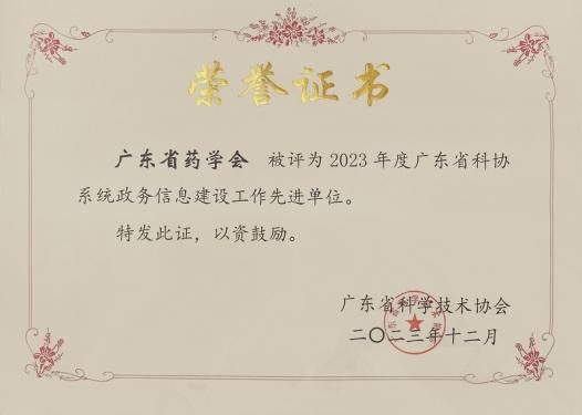 廣東省藥學(xué)會榮獲2023年度省科協(xié)系統(tǒng)政務(wù)信息建設(shè)工作先進單位