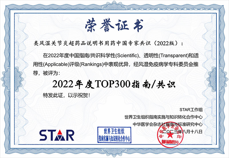 近期,STAR工作組對2022年指南和共識進行了評級工作,由廣東省藥學(xué)會風(fēng)濕免疫用藥專家委員會發(fā)起、中山大學(xué)孫逸仙紀念醫(yī)院風(fēng)濕免疫科和藥學(xué)部制訂的《類風(fēng)濕關(guān)節(jié)炎超藥品說明書用藥中國專家共識(2022版)》被評選為2022年度TOP300指南/共識。STAR工作組,全稱指南科學(xué)性(Scientific)、透明性(Tr...