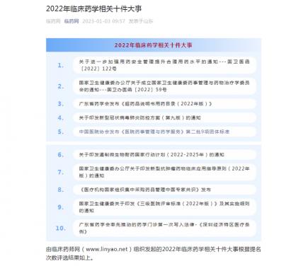 由我國臨床藥學(xué)界具有重要影響力的純民間專業(yè)網(wǎng)站《臨藥網(wǎng)》組織發(fā)起的“2022年臨床藥學(xué)相關(guān)十件大事征集”活動,于1月3日公布了正式結(jié)果:廣東省藥學(xué)會兩項(xiàng)工作“廣東省藥學(xué)會發(fā)布《超藥品說明書用藥目錄(2022年版)》”和“廣東省藥學(xué)會率先推動的藥學(xué)門診第一次寫入法律-《深圳經(jīng)濟(jì)特區(qū)醫(yī)療條例》”分別位列第三位和第十位。...