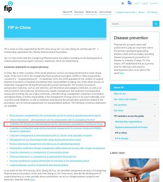 近日,國際藥學聯(lián)合會(FIP)在其全球網(wǎng)站(www.fip.org)開設(shè)的“Pharmacy in China”專欄(https://www.fip.org/pharmacy-in-china)中,全文刊登了由中山大學腫瘤防治中心藥學部劉韜主任及其團隊主筆的《Guidelines for full-process ...